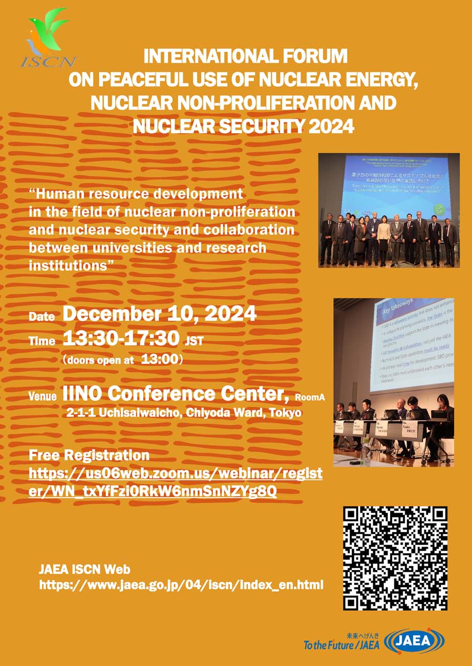 The Integrated Support Center for Nuclear Nonproliferation and Nuclear Security (ISCN) of Japan Atomic Energy Agency (JAEA) holds an annual International Forum on Peaceful Use of Nuclear Energy, Nuclear Non-proliferation and Nuclear Security starts at 13:30, Tuesday, 10 December 2024 (JST). In this forum, ISCN introduces Japan's effort towards nuclear non-proliferation and nuclear security through JAEA, as well as enhances understanding about various issues and policies concerning the peaceful use of nuclear energy and nuclear non-proliferation, and nuclear security. We look forward to your participation.