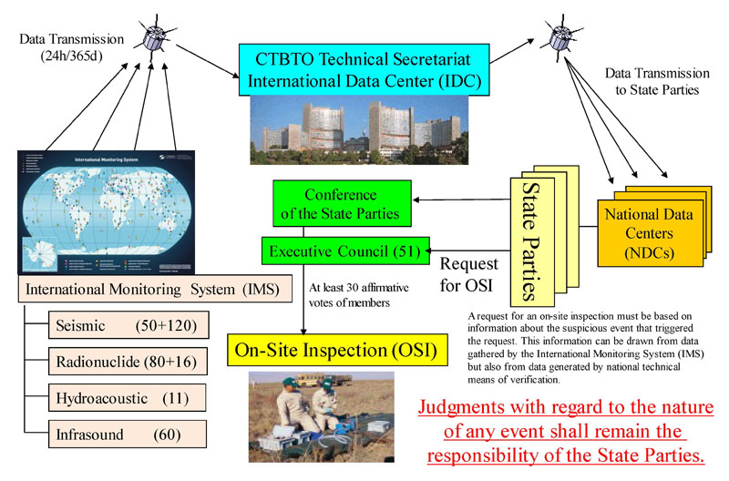 The Comprehensive Nuclear-Test-Ban Treaty (CTBT) prohibits any nuclear weapon test explosion or any other nuclear explosion in all spaces, including cosmic space, the atmosphere, underwater, and underground, and prescribes the establishment of a verification regime to ensure that each member state adheres to the treaty.