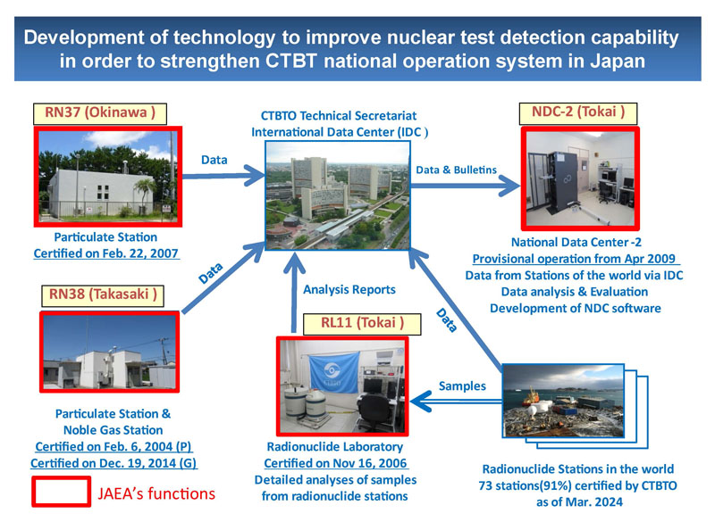 As shown in the figure below, JAEA plays three roles in the CTBT international/national verification regime: it operates two radionuclide stations in Japan, a radionuclide laboratory, and National Data Center (NDC-2) for radionuclide monitoring. JAEA actively cooperates with the government.