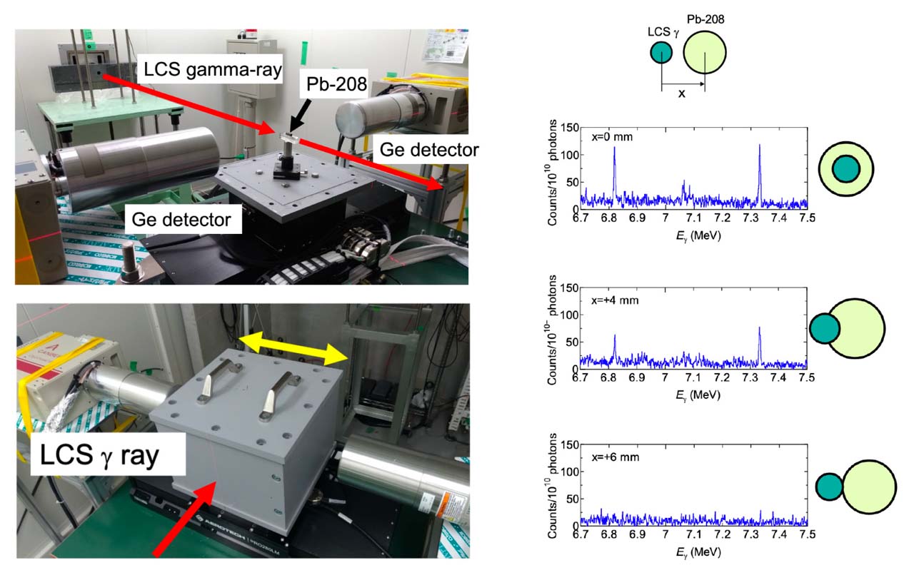 Demonstration of nondestructive identification of Pb-208 isotope shielded in 1 cm iron box. NRF peaks appear only when the gamma-ray hit the isotope of interest. This demonstration experiment has been conducted in the gamma-ray beam line of the New SUBARU facility, University of Hyogo,