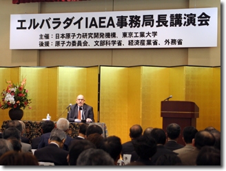 11月30日、独立行政法人日本原子力研究開発機構(原子力機構)と国立大学法人東京工業大学(東工大)の共催による、エルバラダイIAEA事務局長講演会が、如水会館において、約500名の聴衆を集めて開催された(後援:原子力委員会、文部科学省、経済産業省、外務省)。