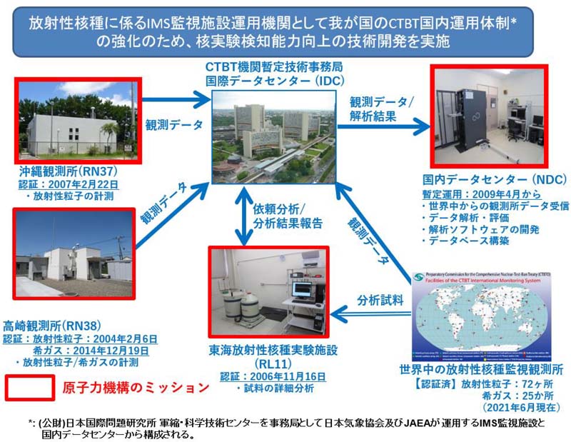 JAEAは、沖縄観測所、高崎観測所、及び東海放射性核種実験施設の整備を完了し、核実験監視のための技術要件を満足する施設としてCTBT機関(CTBTO)の認証を得て運用を行っています。さらに、国内データセンター(NDC-2)では、オーストリアのウィーンにある国際データセンター(IDC)から配信される世界中の放射性核種観測所データを受信し、日常的にデータ解析を実施しています。沖縄観測所は宇宙航空研究開発機構の沖縄宇宙通信所内に、高崎観測所は量子科学技術研究開発機構の高崎量子応用研究所内に設置されています。また、東海放射性核種実験施設とNDC-2は、JAEA原子力科学研究所内に設置されています。
