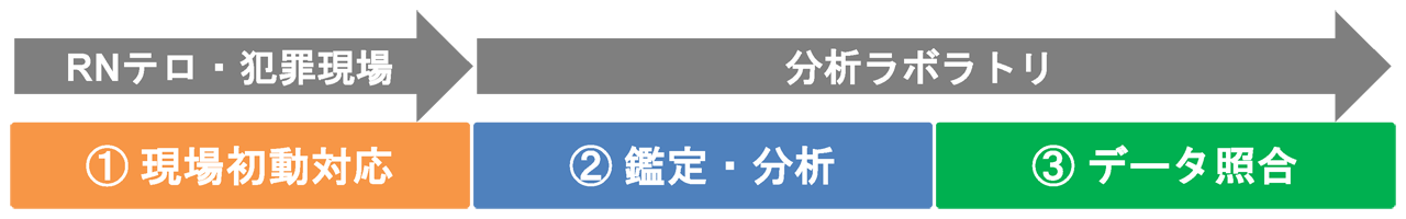 核鑑識とは、捜査当局によって押収、採取された不法な核物質や放射性物質とそれらに関連する物質・物品の組成、物理・化学的形態等を分析し、不法な物質の出所、履歴、輸送経路、目的等を分析・解析することで、捜査活動を支援する技術的手段です。核鑑識に必要な分析技術、分析データを照合するためのデータベース等を含む核鑑識ライブラリ技術の開発や、捜査当局等による現場初動対応を支援する放射線測定技術の開発を行っています。