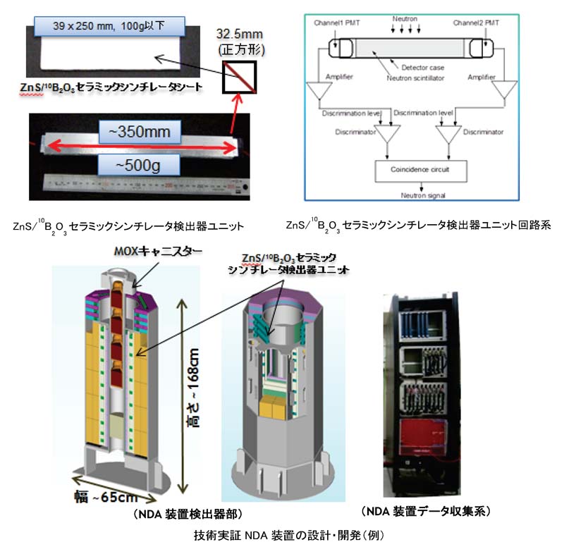 世界的な供給不足にあるヘリウム3(He-3)ガスを使う汎用中性子検出器に代わる(ZnS/10B2O3セラミックシンチレータによる)高効率中性子検出器の開発と、それを使う保障措置非破壊測定(NDA)装置の開発実証をJ-PARCセンター、原子力基礎工学研究センター、再処理技術開発センターの連携で進めています。